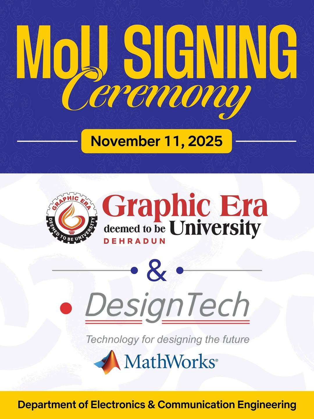Graphic Era (Deemed to be University), Dehradun proudly announces the MoU Signing Ceremony with DesignTech (MathWorks), fostering collaboration in advanced technology and industry–academia partnership through the Department of Electronics & Communication Engineering.