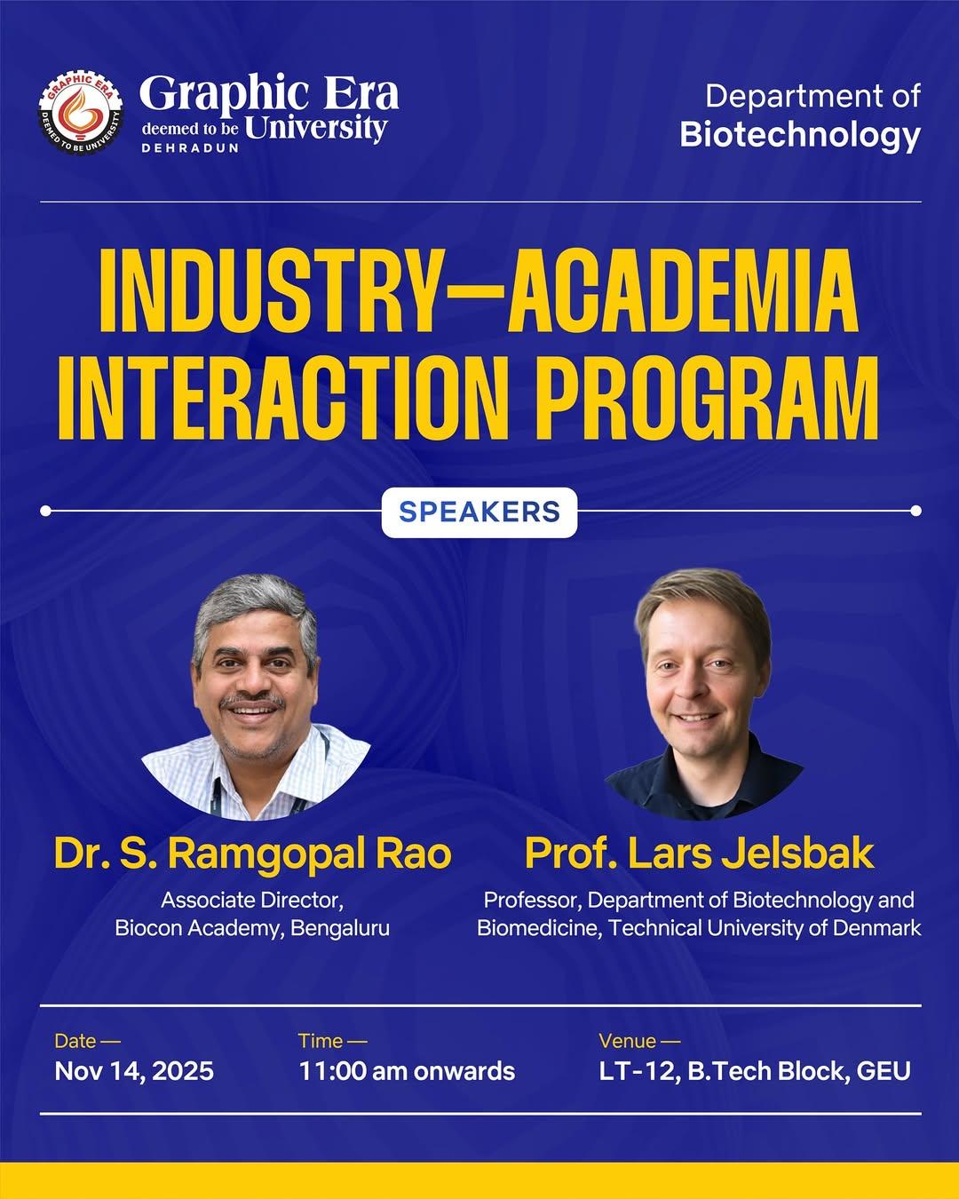 The Department of Biotechnology, Graphic Era (Deemed to be University), Dehradun presents the Industry–Academia Interaction Program featuring Dr. S. Ramgopal Rao, Associate Director, Biocon Academy, Bengaluru, and Prof. Lars Jelsbak, Professor, Technical University of Denmark, fostering knowledge exchange and industry collaboration.