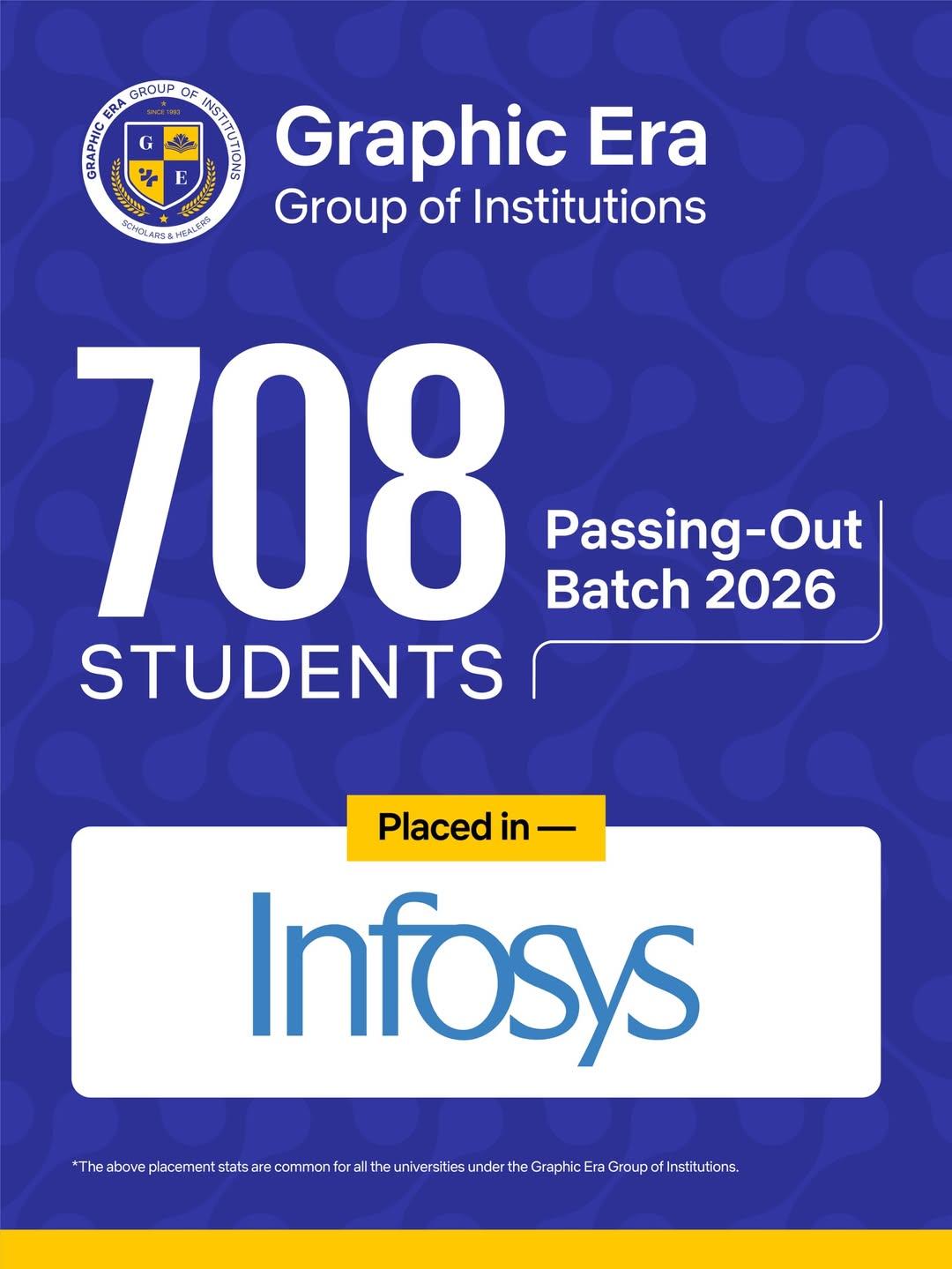 Graphic Era Group of Institutions proudly celebrates the successful placement of 708 students from the Passing-Out Batch 2026, placed in Infosys, reflecting excellence in academics and career readiness.