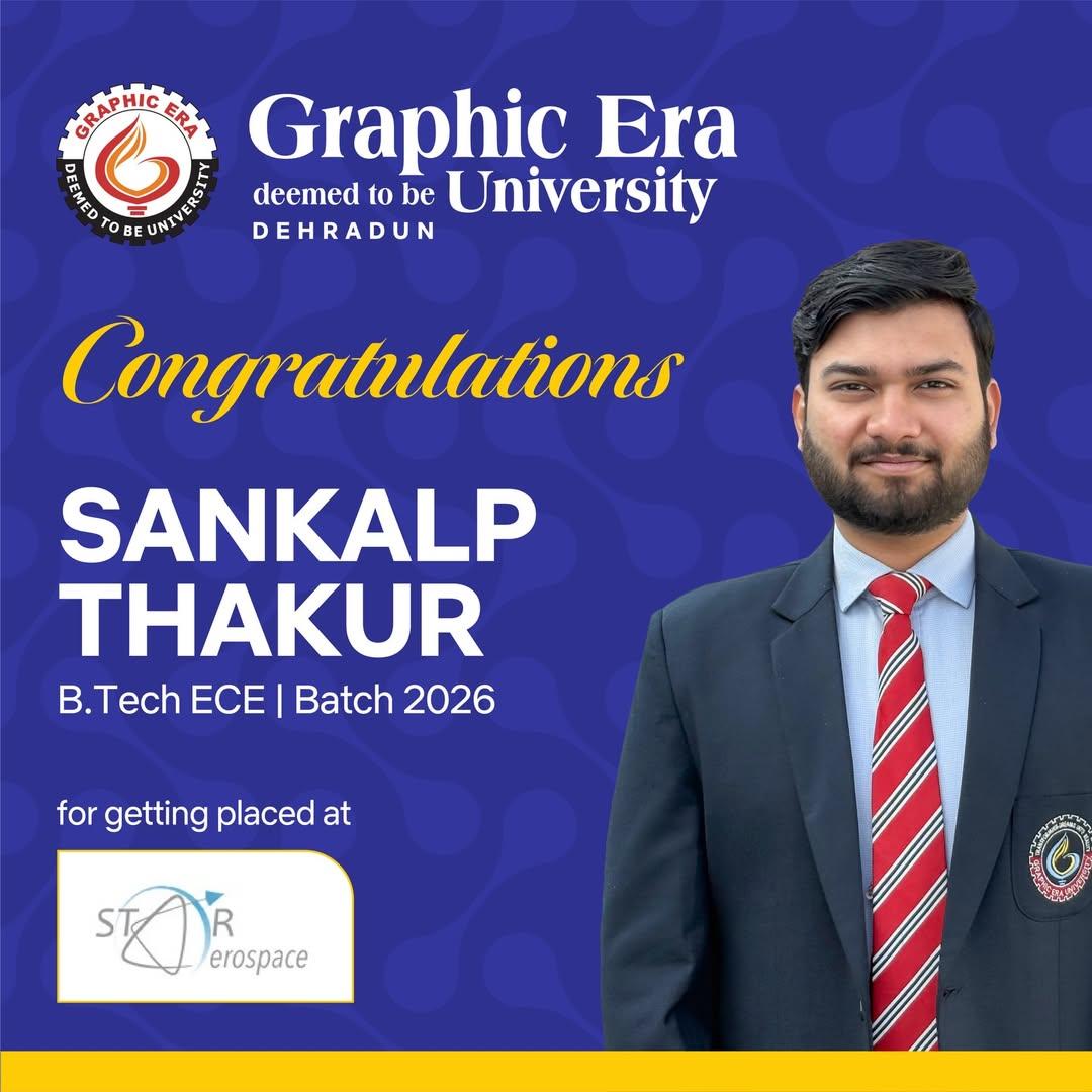 Graphic Era (Deemed to be University), Dehradun congratulates Sankalp Thakur, B.Tech ECE (Batch 2026), on securing placement at STAR Aerospace, marking a proud achievement and a step towards a successful professional journey.