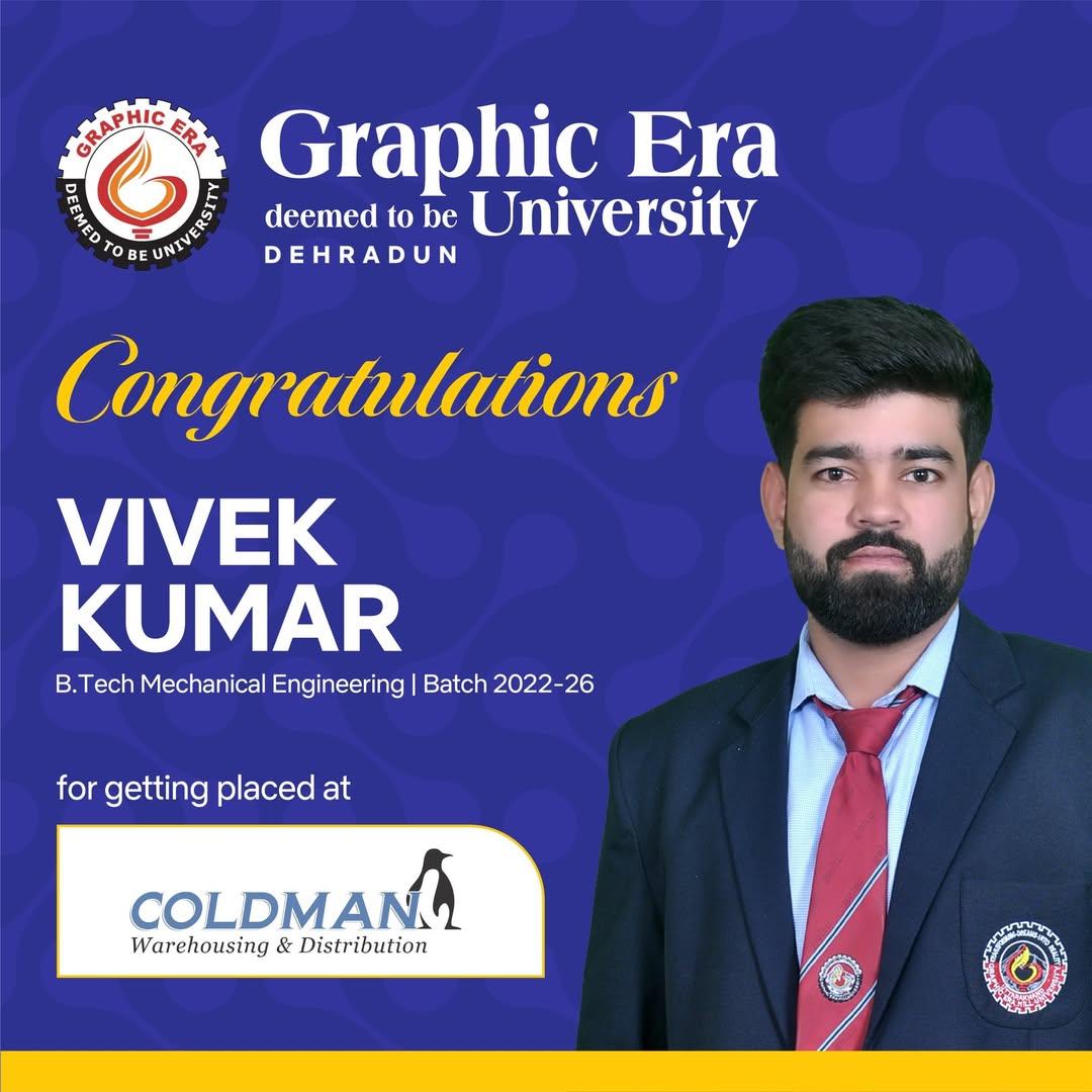 Graphic Era (Deemed to be University), Dehradun congratulates Vivek Kumar, B.Tech Mechanical Engineering (Batch 2022–26), on securing placement at Coldman Warehousing & Distribution, marking a significant milestone in his professional journey.