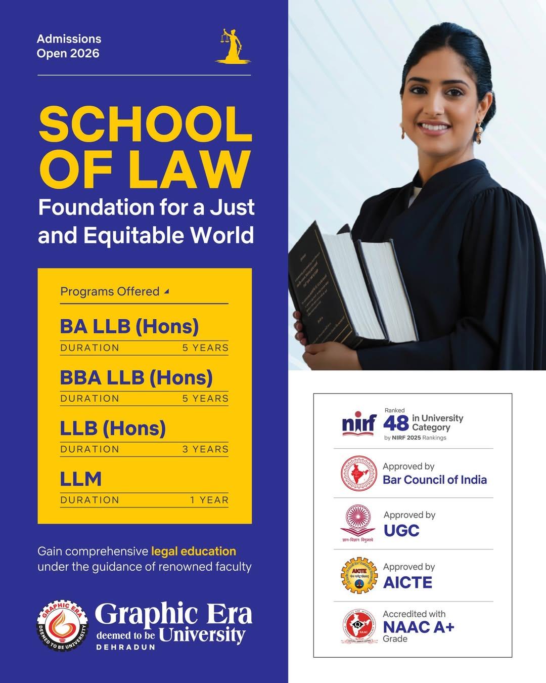 The School of Law, Graphic Era (Deemed to be University), Dehradun offers comprehensive legal education with programs BA LLB (Hons), BBA LLB (Hons), LLB (Hons) and LLM, guided by experienced faculty and a strong academic framework for a just and equitable world.