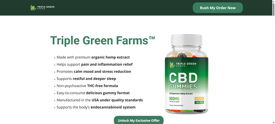 Triple Green Farms CBD Gummies@:- are edible supplements infused with cannabidiol (CBD), a naturally occurring compound derived from the hemp plant. Unlike THC, CBD is non-psychoactive, meaning it does not produce a “high.” These gummies are designed to deliver a pre-measured dose of CBD in a flavorful and chewable form, making them an appealing option for both beginners and...