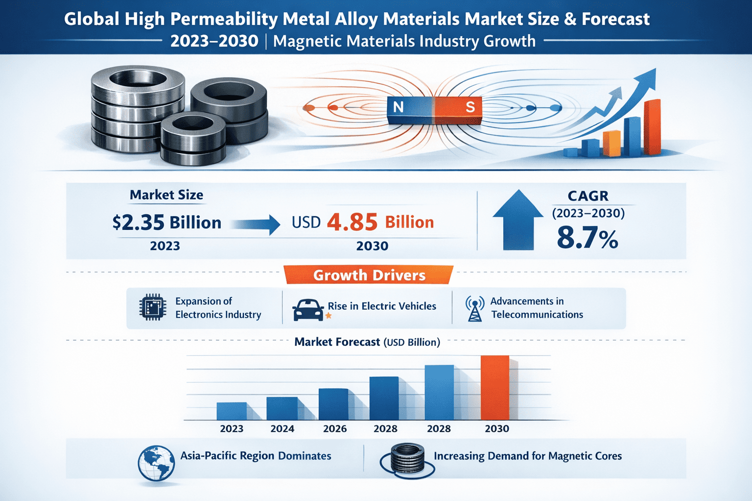 Global High Permeability Metal Alloy Materials Market was valued at USD 569.3 million in 2023 and is projected to reach USD 965.4 million by 2030, exhibiting a Compound Annual Growth Rate (CAGR) of 7.7% during the forecast period (2023-2030). This expansion reflects growing industrial demand for materials that combine exceptional magnetic properties with structural durability across electrical, automotive, and renewable energy applications.