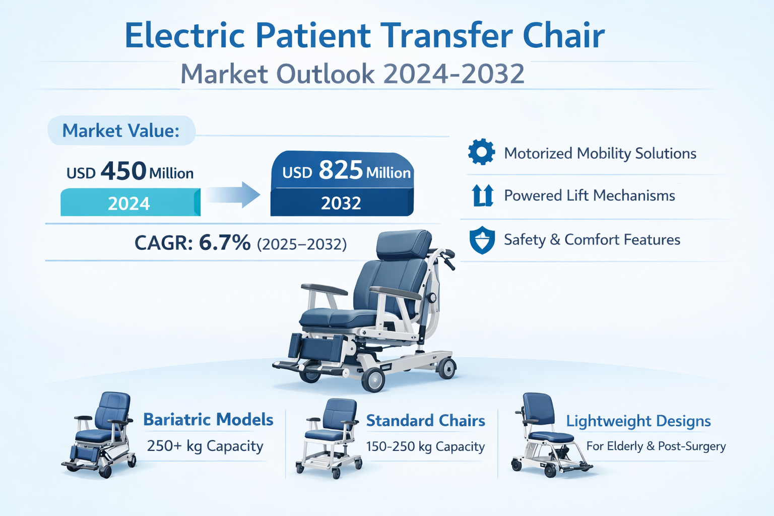 According to a newly published market research report by 24LifeSciences, global electric patient transfer chair market was valued at USD 450 million in 2024 and is projected to reach USD 825 million by 2032, growing at a compound annual growth rate (CAGR) of 6.7% during the forecast period 2025–2032.