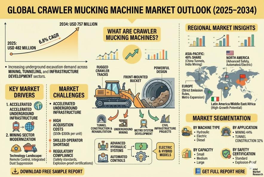 According to a new report from Intel Market Research, the global Crawler Mucking Machine market was valued at USD 482 million in 2025 and is projected to reach USD 757 million by 2034, growing at a steady CAGR of 6.8% during the forecast period. This growth trajectory reflects increasing global demand for underground excavation equipment across mining, tunneling, and infrastructure development sectors.