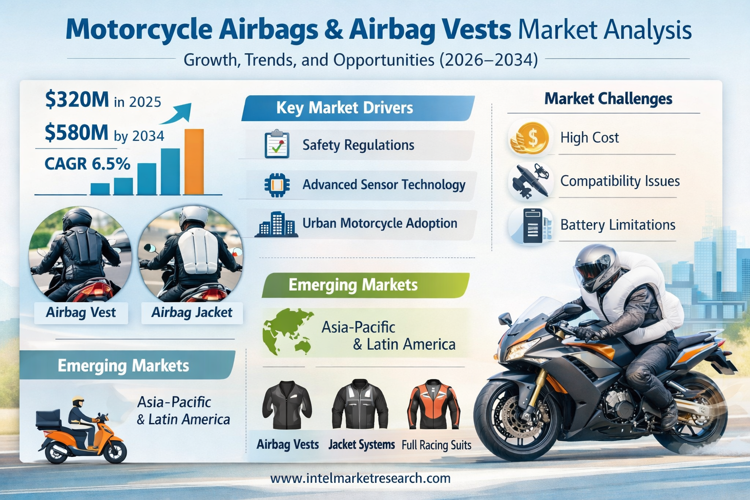 According to a new report from Intel Market Research, the global Motorcycle Airbags and Airbag Vests market was valued at USD 320 million in 2025 and is projected to reach USD 580 million by 2034, growing at a steady CAGR of 6.5% during the forecast period (2026–2034). This growth trajectory reflects increasing safety consciousness among riders coupled with technological innovations in protective gear.