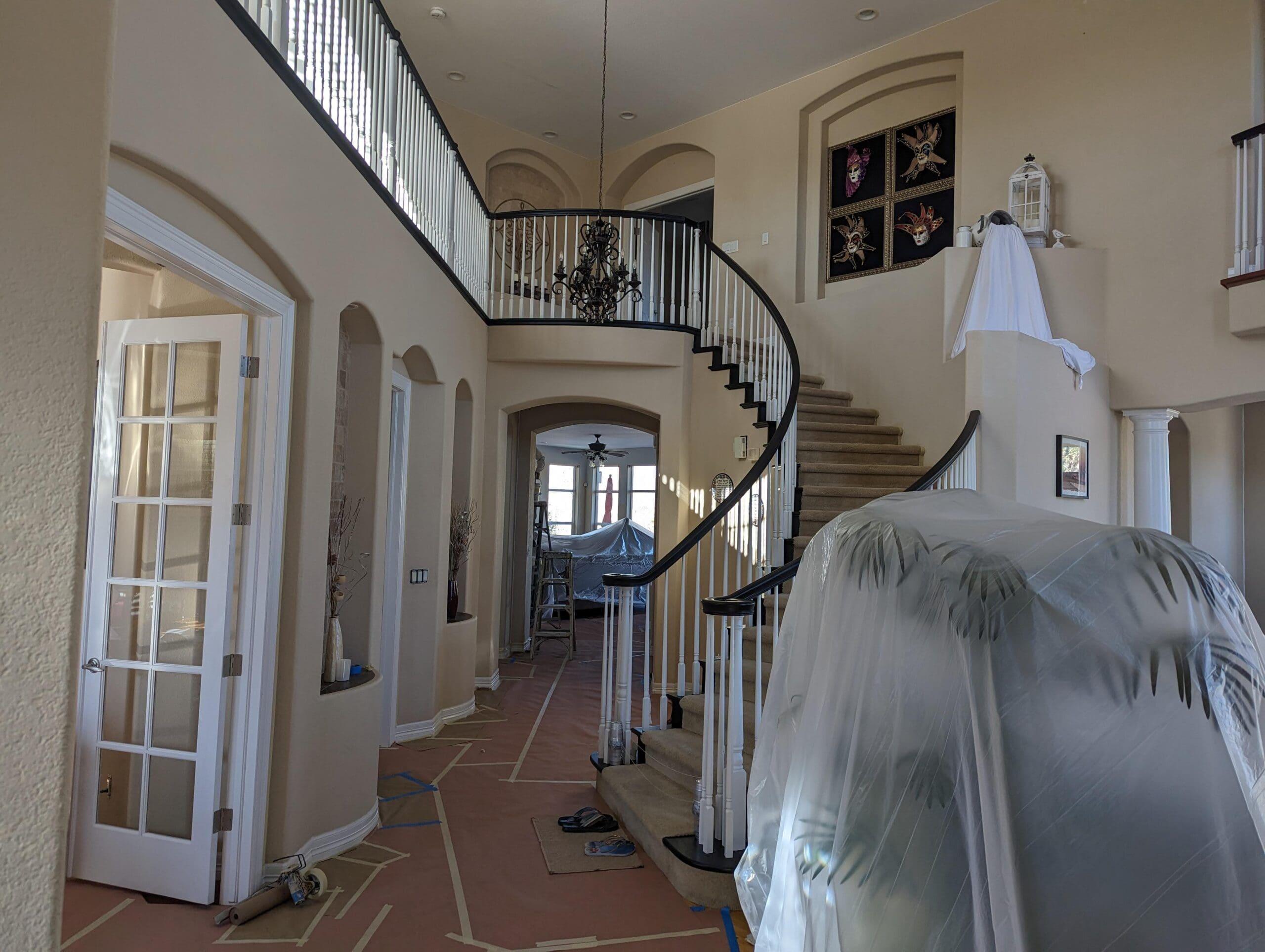 Furniture is covered, surfaces are cleaned, holes are patched, and walls are sanded to create the perfect base.