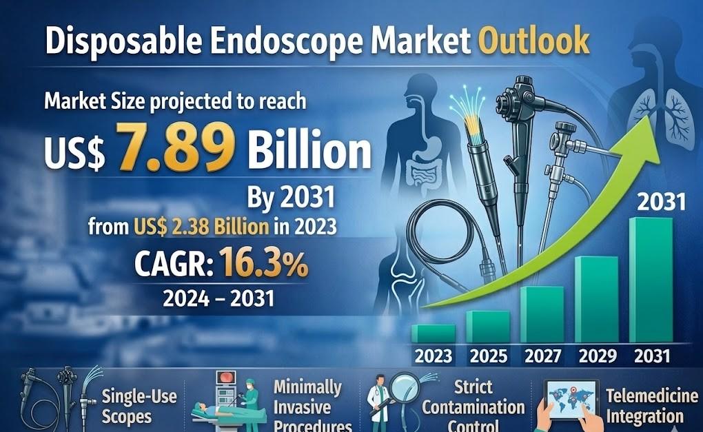The Disposable Endoscope Market Analysis highlights that the market is projected to grow from US$ 2.38 billion in 2023 to US$ 7.89 billion by 2031, registering a CAGR of 16.3% during 2024 to 2031. This growth is primarily driven by the rising burden of hospital-acquired infections, increasing adoption of minimally invasive procedures, and supportive government initiatives promoting safer healthcare practices.