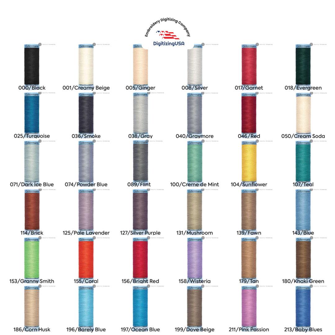 The Gutermann thread color chart is a reference guide that displays a wide range of thread colors offered by Gutermann, a globally recognized thread manufacturer. Each color is assigned a unique code, making it easier for designers and digitizers to select and match thread colors accurately.