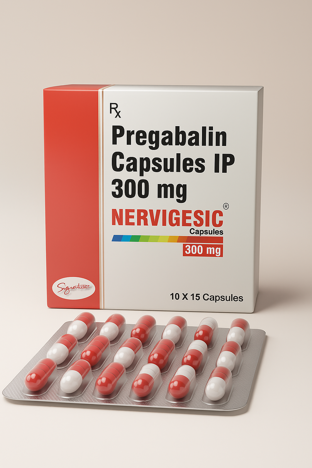 Nervigesic 300 mg Capsule is a prescription medication designed to alleviate nerve-related pain and discomfort. Its active ingredient works by modulating pain signals in the nervous system, helping reduce sensations of burning, tingling, or stabbing pain.