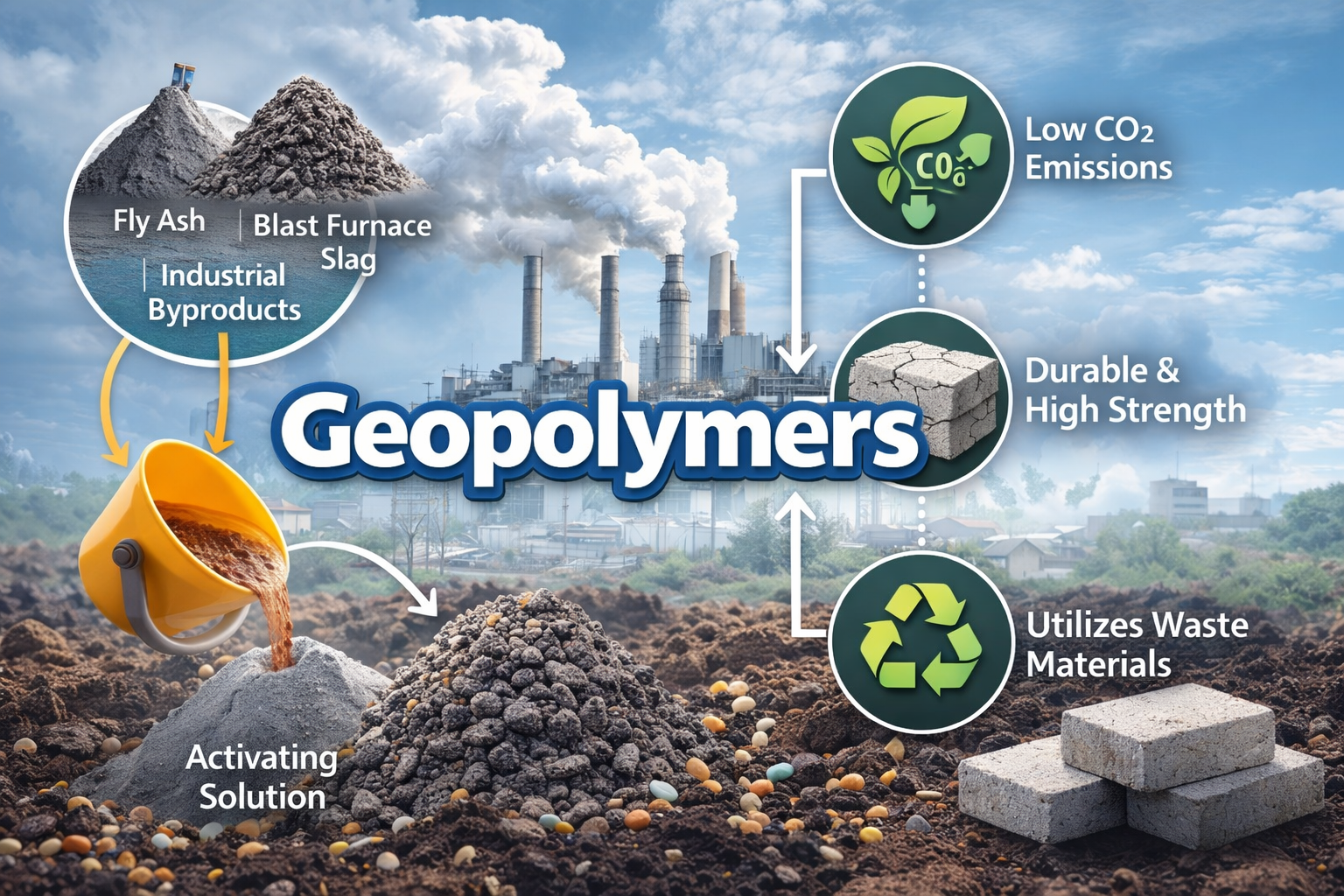 - Construction: Geopolymers are used in precast concrete, panels, and high-performance structures due to durability, low carbon footprint, and fire resistance.