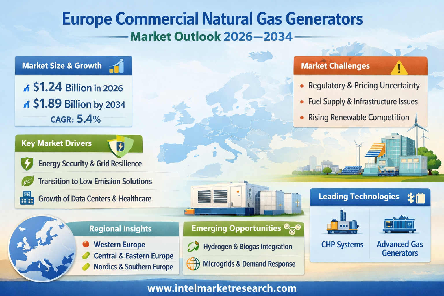 According to a new report from Intel Market Research, the Europe Commercial Natural Gas Generators Market was valued at USD 1.15 billion in 2025 and is projected to grow from USD 1.24 billion in 2026 to USD 1.89 billion by 2034, exhibiting a robust CAGR of 5.4% during the forecast period (2026–2034). This steady expansion is underpinned by the region's stringent environmental mandates, growing demand for energy-resilient infrastructure, and the accelerating transition away from diesel-powered generation toward cleaner, low-emission alternatives.