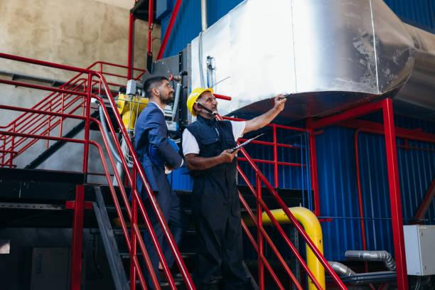 workers in an industrial plant check the systems with modern technology workers in an industrial plant check the systems with modern technology boiler rental companies stock pictures, royalty-free photos & images