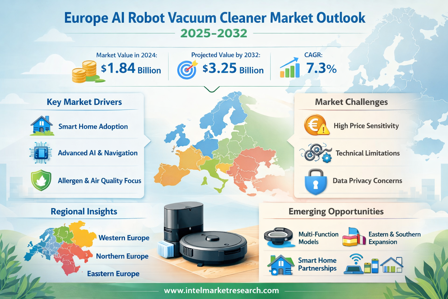 According to a new report from Intel Market Research, the Europe AI Robot Vacuum Cleaner Market was valued at USD 1.84 billion in 2024 and is projected to grow from USD 1.98 billion in 2025 to USD 3.25 billion by 2032, exhibiting a robust CAGR of 7.3% during the forecast period (2025–2032). This growth is propelled by the accelerating consumer demand for smart home automation solutions, continuous advancements in LiDAR and SLAM navigation technologies, and the expanding penetration of AI-powered home appliances across both mature and emerging European markets.
