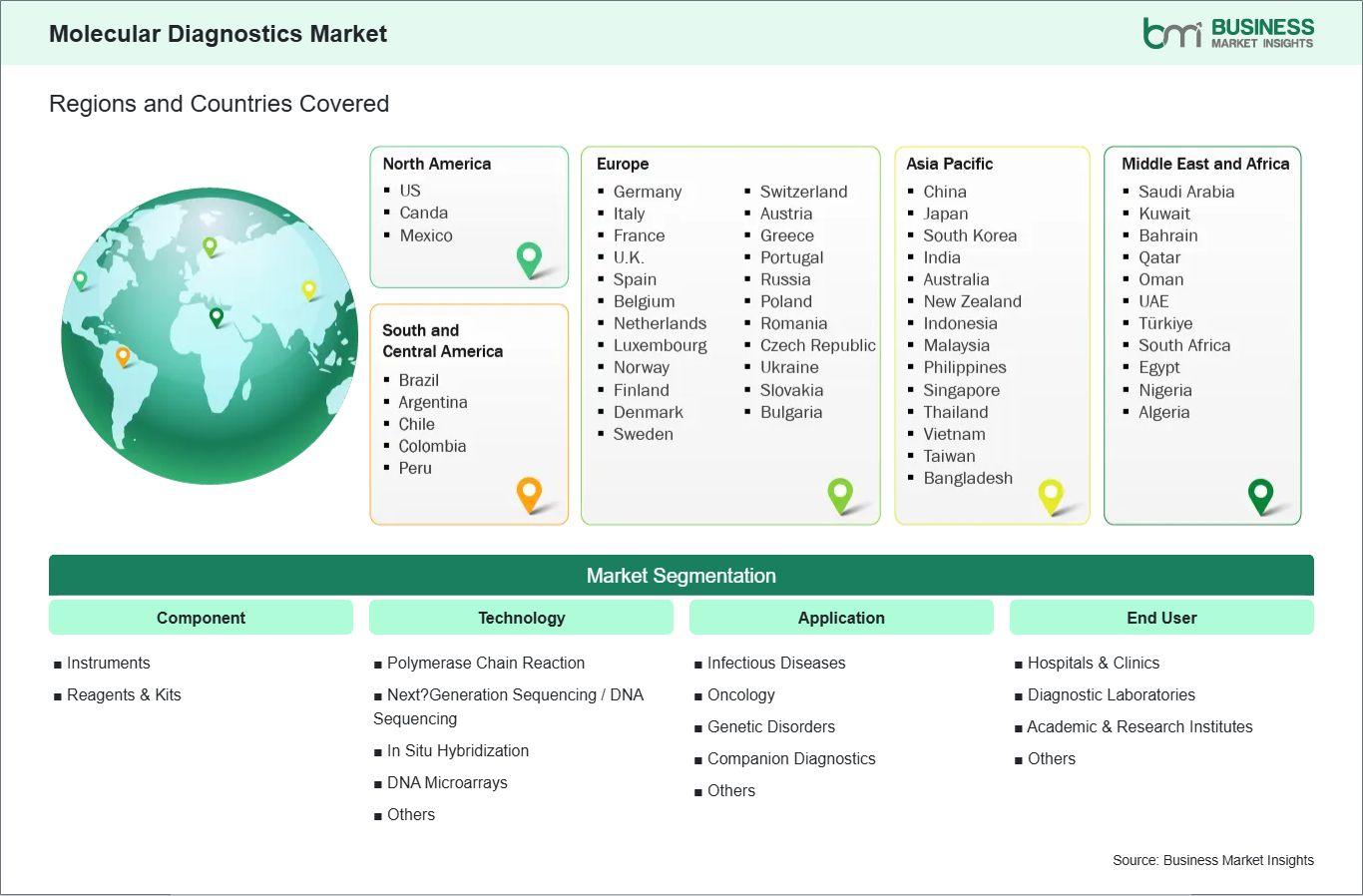 The growth in use of point-of-care (POC) diagnostic solutions is fueling the growth of the Molecular Diagnostics Market. The introduction of technology-driven innovations which are smaller, faster, and better to use have led to the creation of POC molecular testing systems that are deployable outside traditional laboratory environments (e.g. clinics, rural clinics, and even in low-resource locations). Timely diagnosis of disease provides an essential tool to clinicians regarding decision-making for immediate clinical intervention regarding infectious disease outbreaks and monitoring patients for cancer therapy. While many of the world’s emerging economies (e.g. Asia-Pacific, Latin America, and Africa) are benefiting from increased healthcare spending, developed medical infrastructure, and increased familiarity with molecular testing, these regions are ripe for increased growth in the molecular diagnostics market. The increased incidence of infectious diseases, as well as ongoing government support in these regions for enhancing diagnostic capabilities, are aiding in-creased adoption of molecular testing in these areas. Furthermore, there is an increasing interest and demand for lower cost and higher accuracy POC molecular tests that can expand into untapped markets due to the availability of new technologies. Establishing business relationships with local healthcare providers, investing in mobile/portable diagnostic systems, and developing culturally and regionally specific testing procedures and products are additional areas for growth and potential market entry. Leveraging trends in the above categories will allow companies to broaden their brand awareness, increase access to healthcare services, and support long-term growth within the Market.