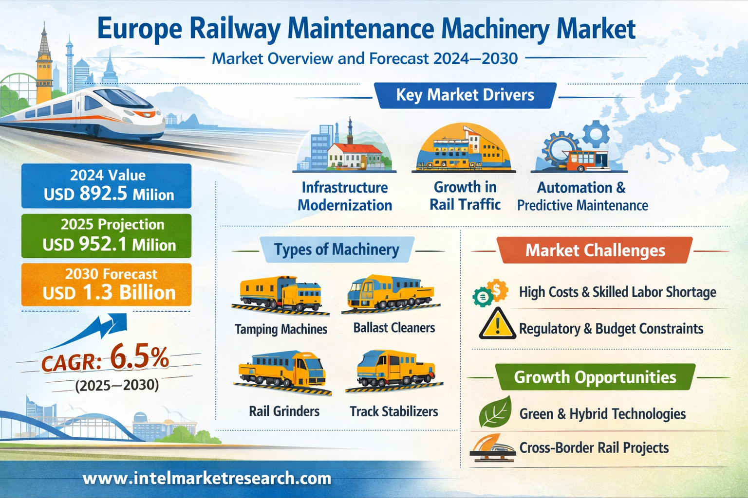 The Europe Railway Maintenance Machinery Market was valued at USD 892.5 million in 2024 and is projected to grow from USD 952.1 million in 2025 to reach USD 1.3 billion by 2030, growing at a CAGR of 6.5% during the forecast period.