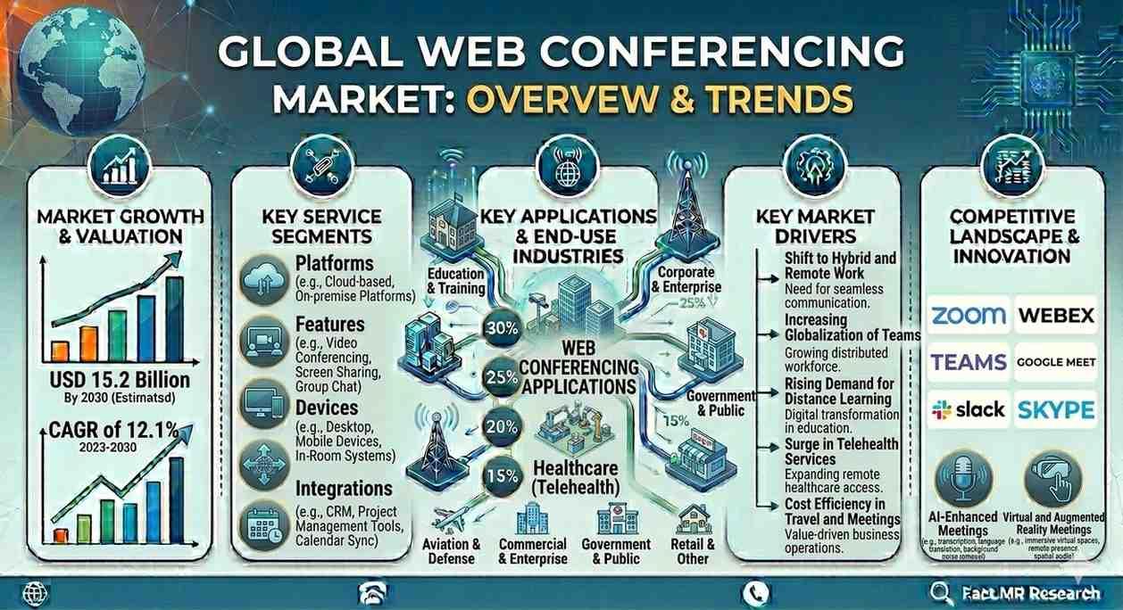 The web conferencing market is evolving into AI-driven collaboration ecosystems supporting hybrid work, digital education, and virtual services.