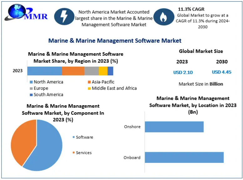The global Marine & Marine Management Software Market is rapidly evolving as the maritime industry embraces digitalization to improve operational efficiency, sustainability, and decision-making. Valued at USD 2.10 billion in 2023, the market is projected to reach USD 4.45 billion by 2030, growing at a strong CAGR of 11.3%.