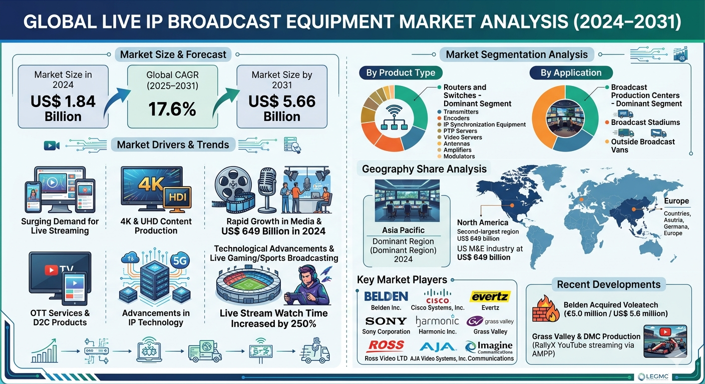The Live IP Broadcast Equipment Market Analysis is experiencing significant growth and is projected to rise from US$ 1.84 billion in 2024 to US$ 5.66 billion by 2031, registering an impressive CAGR of 17.6% during 2025–2031. This surge is largely attributed to the rising adoption of IP-based solutions, increased demand for live content, and advancements in broadcasting technologies.