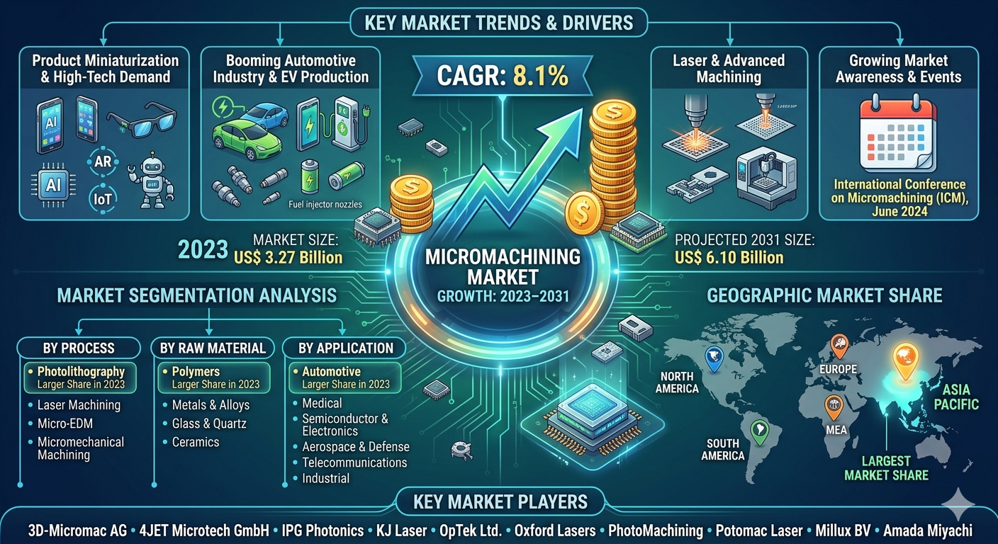 The Micromachining Market Growth is experiencing notable growth as North American industries increasingly integrate advanced machining technologies into their production processes. According to industry analysis, the micromachining market size is projected to reach US$ 6.10 billion by 2031 from US$ 3.27 billion in 2023. The market is expected to register a CAGR of 8.1% during 2023–2031. The rising focus on miniaturized electronics, advancements in laser machining technologies, and growing demand for precision components in aerospace and healthcare industries are among the major factors driving the expansion of micromachining solutions across the region.