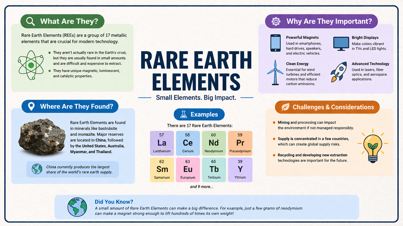 Rare Earth Elements (REEs) are a group of critical metals widely used in advanced technologies due to their unique magnetic, optical, and catalytic properties. These materials are essential in electric vehicles, renewable energy systems, electronics, aerospace, and defense applications where high performance and efficiency are required.