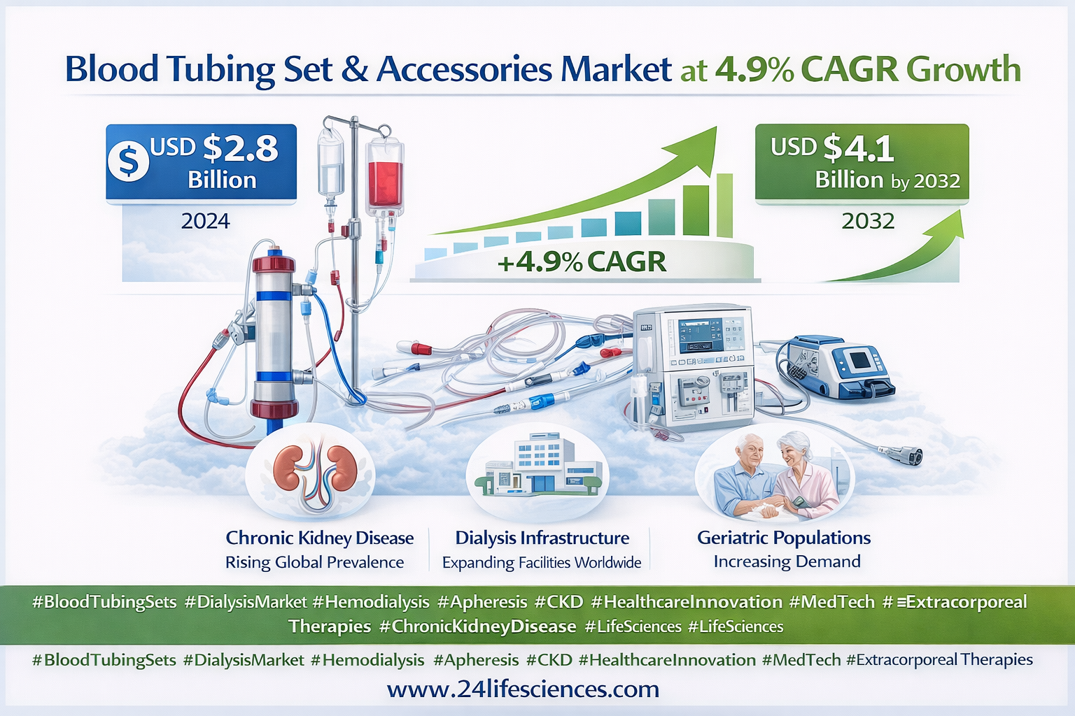 Blood Tubing Set and Accessories market was valued at USD 2.8 billion in 2024 and is projected to reach USD 4.1 billion by 2032, growing at a CAGR of 4.9% during the forecast period. The market is a crucial segment of healthcare and life sciences, enabling safe and efficient hemodialysis, apheresis, and other extracorporeal therapies. Rising prevalence of chronic kidney disease (CKD), expanding dialysis infrastructure, and increasing geriatric populations are primary drivers fueling consistent market growth globally.