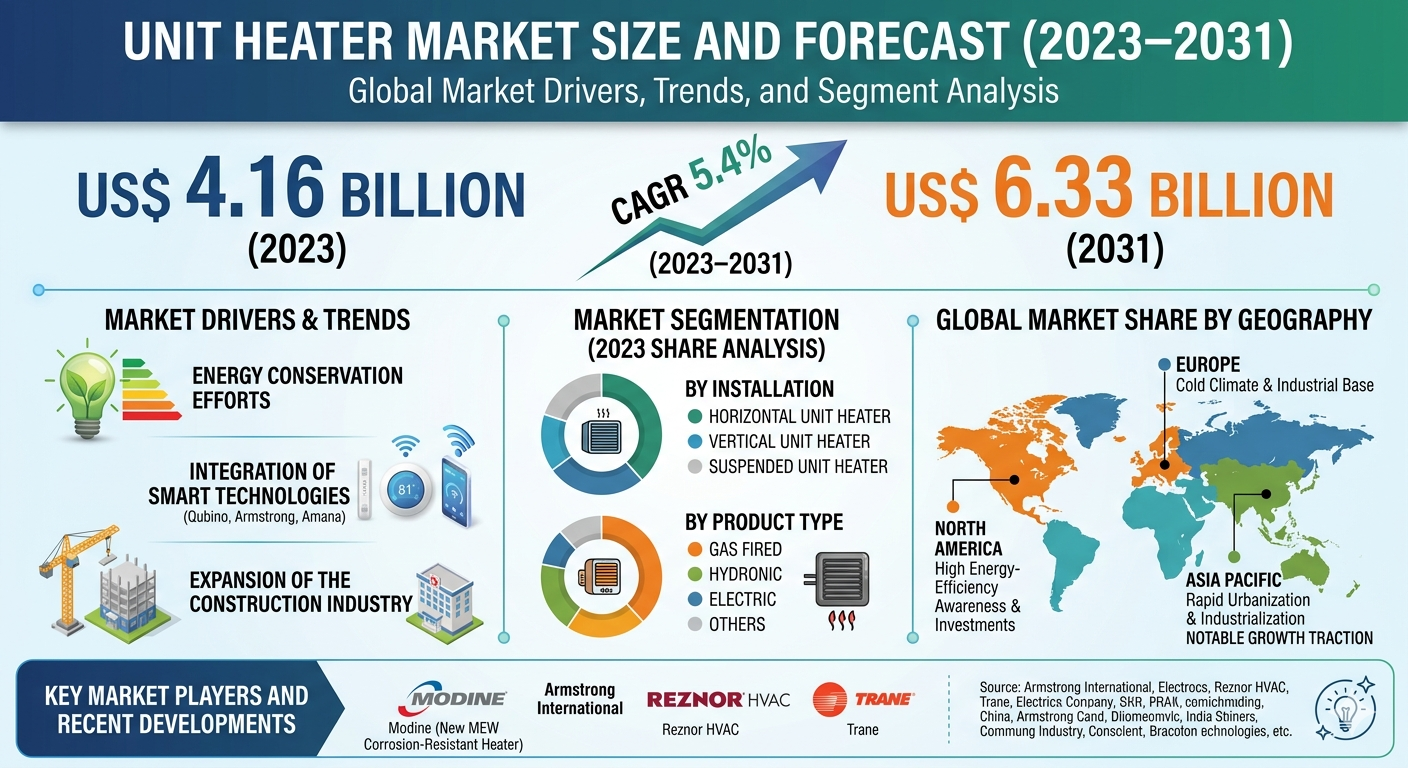The Unit Heater Market Share continues to expand steadily, supported by strong demand across North America and other regions. The market is projected to grow from US$ 4.16 billion in 2023 to US$ 6.33 billion by 2031, registering a CAGR of 5.4% during the forecast period. North America remains a key contributor due to its advanced HVAC infrastructure, high adoption of smart technologies, and strict energy efficiency standards.