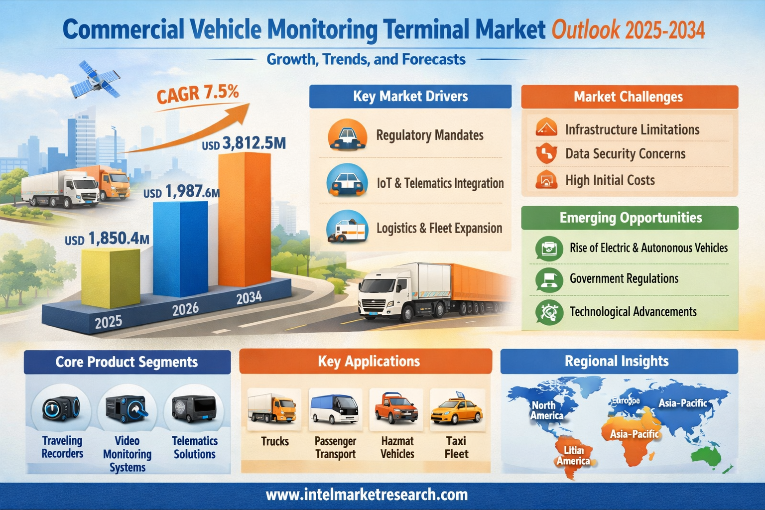 According to a new report from Intel Market Research, the global Commercial Vehicle Monitoring Terminal market was valued at USD 1,850.4 million in 2025 and is projected to grow from USD 1,987.6 million in 2026 to USD 3,812.5 million by 2034, exhibiting a CAGR of 7.5% during the forecast period (2025–2034). This growth is propelled by tightening government mandates on commercial fleet safety compliance, rapid expansion of logistics and freight networks globally, accelerating adoption of IoT-enabled telematics infrastructure, and increasing road accidents involving commercial vehicles.