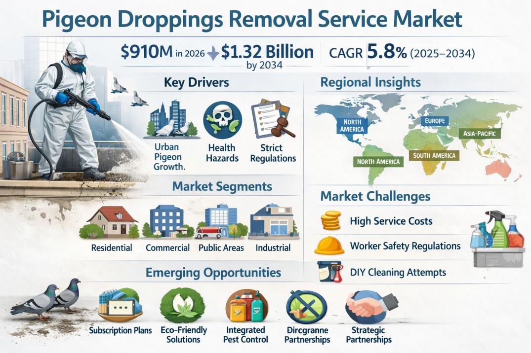 According to a new report from Intel Market Research, the global Pigeon Droppings Removal Service market was valued at USD 850 million in 2025 and is projected to grow from USD 910 million in 2026 to reach USD 1.32 billion by 2034, exhibiting a robust CAGR of 5.8% during the forecast period (2025–2034). This growth is propelled by increasing urban pigeon populations, heightened awareness of zoonotic disease risks, and stricter public health regulations mandating professional sanitation services across commercial and municipal properties.