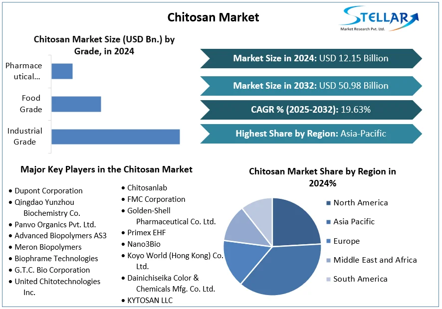 The global Chitosan Market size was valued at USD 12.15 Billion in 2024. The market is expected to grow at a CAGR of 19.63 % during the forecast period from 2025-2032, reaching nearly USD 50.98 Billion by 2032.