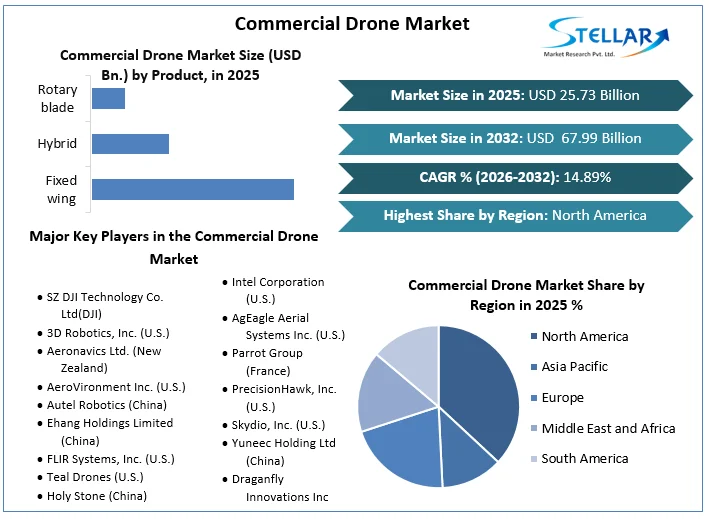 The global Commercial Drone Market size was valued at USD 25.73 Billion in 2025. The market is expected to grow at a CAGR of 14.89 % during the forecast period from 2026-2032, reaching nearly USD 67.99 Billion by 2032.