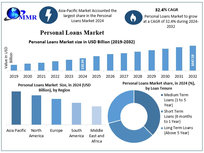 Personal Loans Market size was valued at USD 110.94 Bn in 2024 and is expected to reach USD 1047.59 Bn by 2032, at a CAGR of 32.4%
