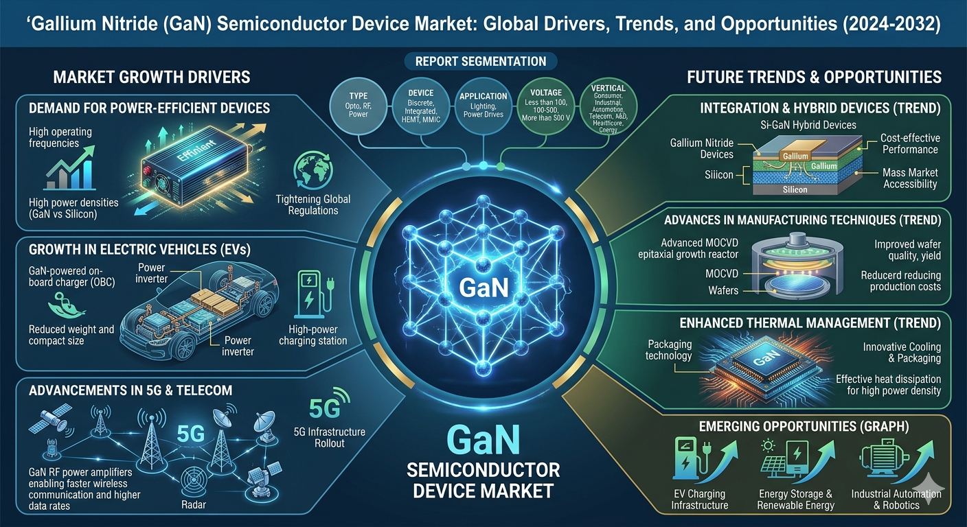 The Gallium Nitride (GaN) Semiconductor Device Market Analysis in North America is witnessing increasing adoption as industries focus on improving energy efficiency and developing high-performance electronic systems. GaN semiconductor devices are widely used in power electronics and radio frequency applications due to their ability to operate at higher voltages, frequencies, and temperatures. Their superior efficiency enables engineers to design compact and high-performance electronic solutions across multiple industrial applications.