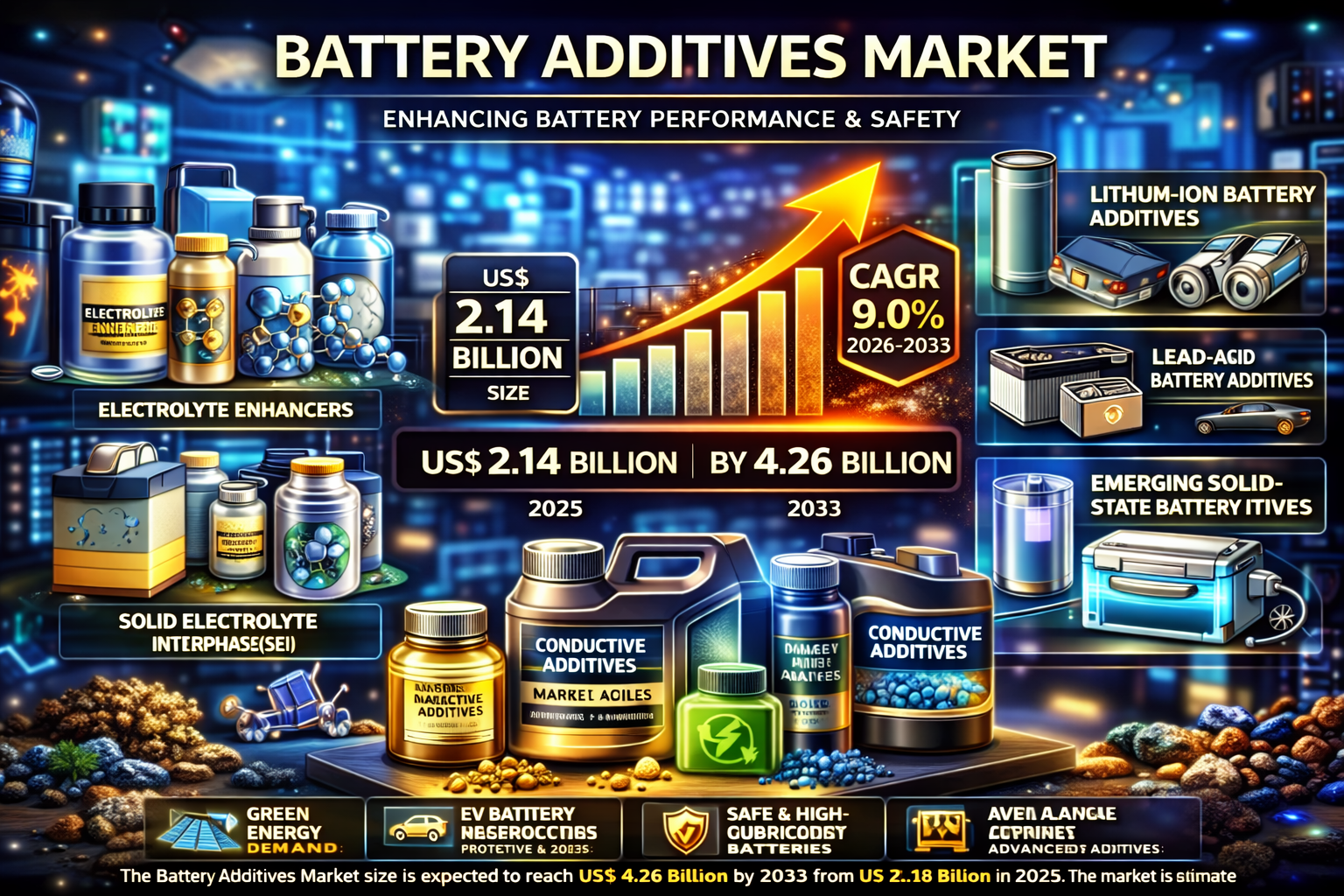 As manufacturers strive to push the limits of lithium-ion and solid-state chemistries, the demand for high-performance additives like carbon nanotubes, graphene, and specialized electrolytes is surging. The Battery Additives Market size is expected to reach US$ 4.26 Billion by 2033 from US$ 2.14 Billion in 2025. The market is estimated to record a CAGR of 9.0% from 2026 to 2033. This steady growth is fueled by the rapid expansion of the automotive sector and the global push for carbon neutrality.