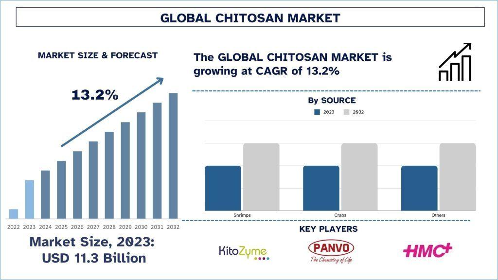 The Chitosan Market was valued at USD 11.3 Billion in 2023 and is expected to grow at a strong CAGR of around 13.2% during the forecast period (2024-2032)