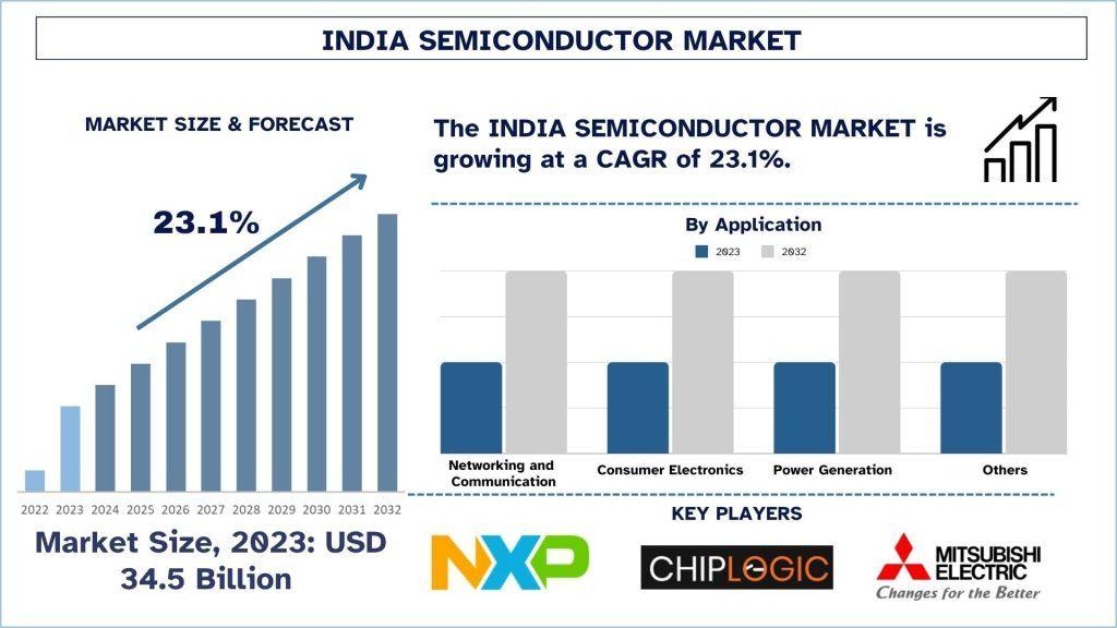 The India Semiconductor Market was valued at USD 34.5 billion in 2023 and is expected to grow at a strong CAGR of around 23.1% during the forecast period (2024-2032)