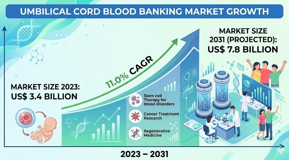 The Umbilical Cord Blood Banking Market Drivers are strongly influenced by the rising demand for stem cell therapies, advancements in regenerative medicine, and increasing government support. These factors collectively contribute to the steady growth of the industry, with projections indicating a rise from US$ 3.4 billion in 2023 to US$ 7.8 billion by 2031, registering a CAGR of 11.0% during the forecast period.
