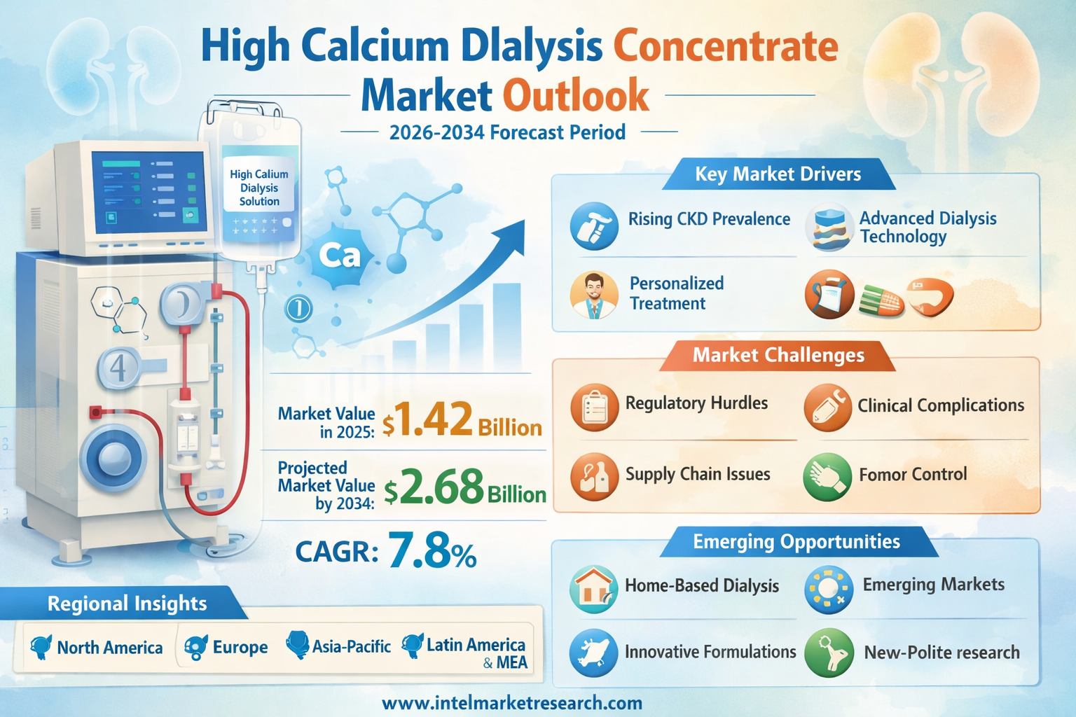 According to a new report from Intel Market Research, the global High Calcium Dialysis Concentrate market was valued at USD 1.42 billion in 2025 and is projected to reach USD 2.68 billion by 2034, growing at a robust CAGR of 7.8% during the forecast period (2026–2034). This growth is propelled by the rising prevalence of chronic kidney disease (CKD) globally, coupled with increasing demand for advanced dialysis solutions, technological advancements in hemodialysis equipment, and growing healthcare expenditure.
