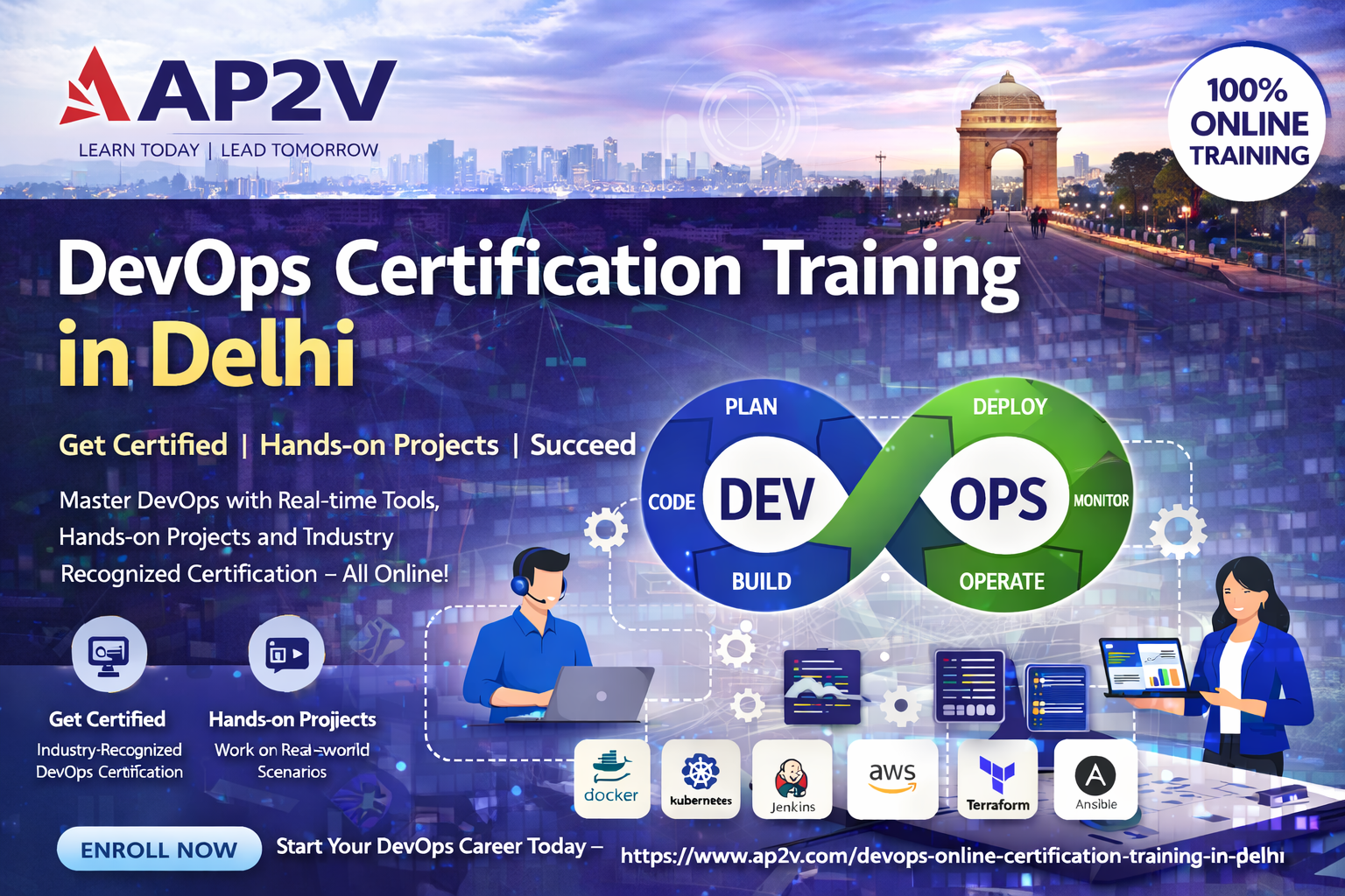 DevOps Certification Training in Delhi – Learn & Get Hired Visit Our Website : https://www.ap2v.com/devops-online-certification-training-in-delhi In today’s fast-moving IT industry, companies are constantly looking for professionals who can streamline development processes and deliver software quickly. This is why DevOps has become one of the most in-demand skills. Enrolling in DevOps Certification Training in Delhi is a smart choice for students and working professionals who want to build a strong and successful career in technology. A well-designed DevOps Certification Training in Delhi program covers both basic and advanced concepts in a simple and practical way. Students learn important topics such as continuous integration, continuous delivery, cloud computing, infrastructure as code, and automation. Along with theoretical knowledge, learners also gain hands-on experience with popular tools like Git, Jenkins, Docker, Kubernetes, and Ansible. These tools are widely used in real-world environments to improve efficiency and collaboration between development and operations teams. One of the biggest advantages of joining DevOps Certification Training in Delhi is practical exposure. Most training institutes provide real-time projects, lab sessions, and assignments that help students understand how DevOps works in actual industry scenarios. This hands-on approach makes learning easy and builds confidence. Another important benefit of DevOps Certification Training in Delhi is career support. Many institutes offer resume-building guidance, interview preparation, and certification assistance. This helps learners prepare for job roles such as DevOps Engineer, Cloud Engineer, Automation Engineer, and Site Reliability Engineer. Delhi is a major hub for IT education and training, offering flexible learning options such as classroom sessions, online courses, and weekend batches. Whether you are a fresher or an experienced professional, enrolling in DevOps Certification Training in Delhi can help you upgrade your skills, earn valuable certifications, and improve your chances of securing high-paying opportunities in the IT industry.