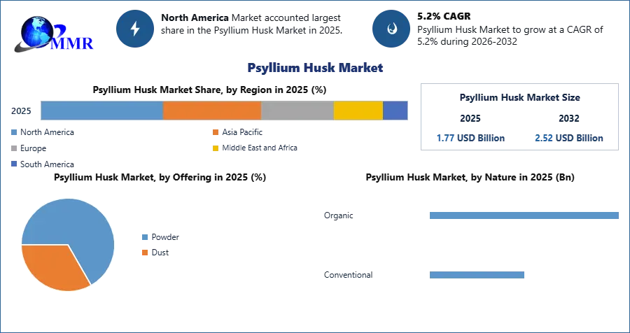 The global Psyllium Husk Market continues to gain significant traction as consumer preference shifts toward natural, plant-based, and fiber-rich dietary solutions. Valued at USD 1.77 Billion in 2025, the market is projected to grow at a CAGR of 5.2% from 2026 to 2032, reaching nearly USD 2.52 Billion by 2032. Increasing awareness of digestive health, expanding nutraceutical applications, and rising demand for clean-label ingredients are collectively driving the global market forward.
