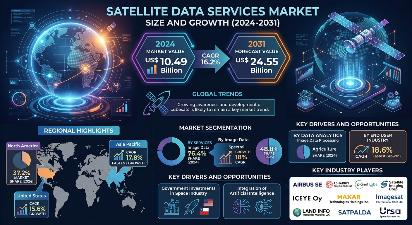 The Satellite Data Services Market Analysis is witnessing robust expansion driven by rising demand for high-resolution Earth observation data and growing adoption of advanced analytics platforms. The satellite data services market size was valued at US$ 10.49 billion in 2024 and is expected to reach US$ 24.55 billion by 2031, registering a CAGR of 16.2% from 2025 to 2031. Increasing government investments in space programs, rising commercialization of satellite constellations, and expanding applications in climate monitoring, defense intelligence, and urban planning are significantly contributing to market growth. As industries continue shifting toward data-driven decision-making, satellite-derived insights are becoming critical infrastructure for global digital transformation.