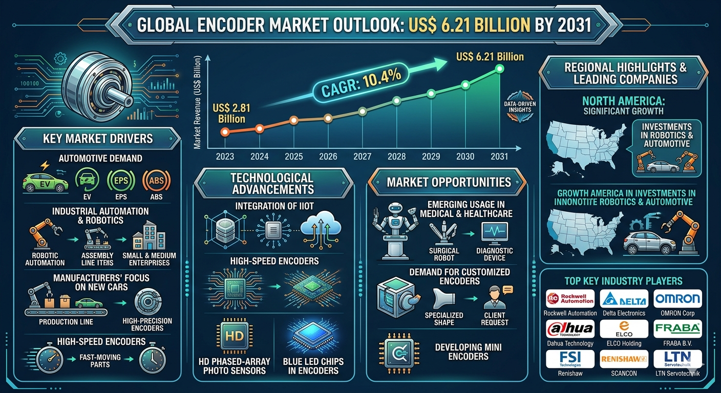 The Encoder Market Analysis is experiencing strong growth due to increasing adoption of automation technologies and expanding demand for precision motion control solutions across industries. The encoder market size is projected to reach US$ 6.21 billion by 2031 from US$ 2.81 billion in 2023, registering a CAGR of 10.4% during 2023–2031. The growing adoption of industrial robotics, the expansion of smart manufacturing facilities, and the rising need for advanced motion feedback systems are among the key factors driving the growth of the encoder market worldwide.