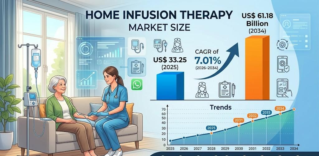 The Home Infusion Therapy Market Segmentation Analysis highlights how different segments contribute to overall growth and innovation. The industry is projected to expand from US$ 33.25 Billion in 2025 to US$ 61.18 Billion by 2034, registering a CAGR of 7.01% during 2026–2034. This steady growth is driven by the increasing prevalence of chronic diseases, cost advantages of home care, and continuous technological advancements in infusion systems.