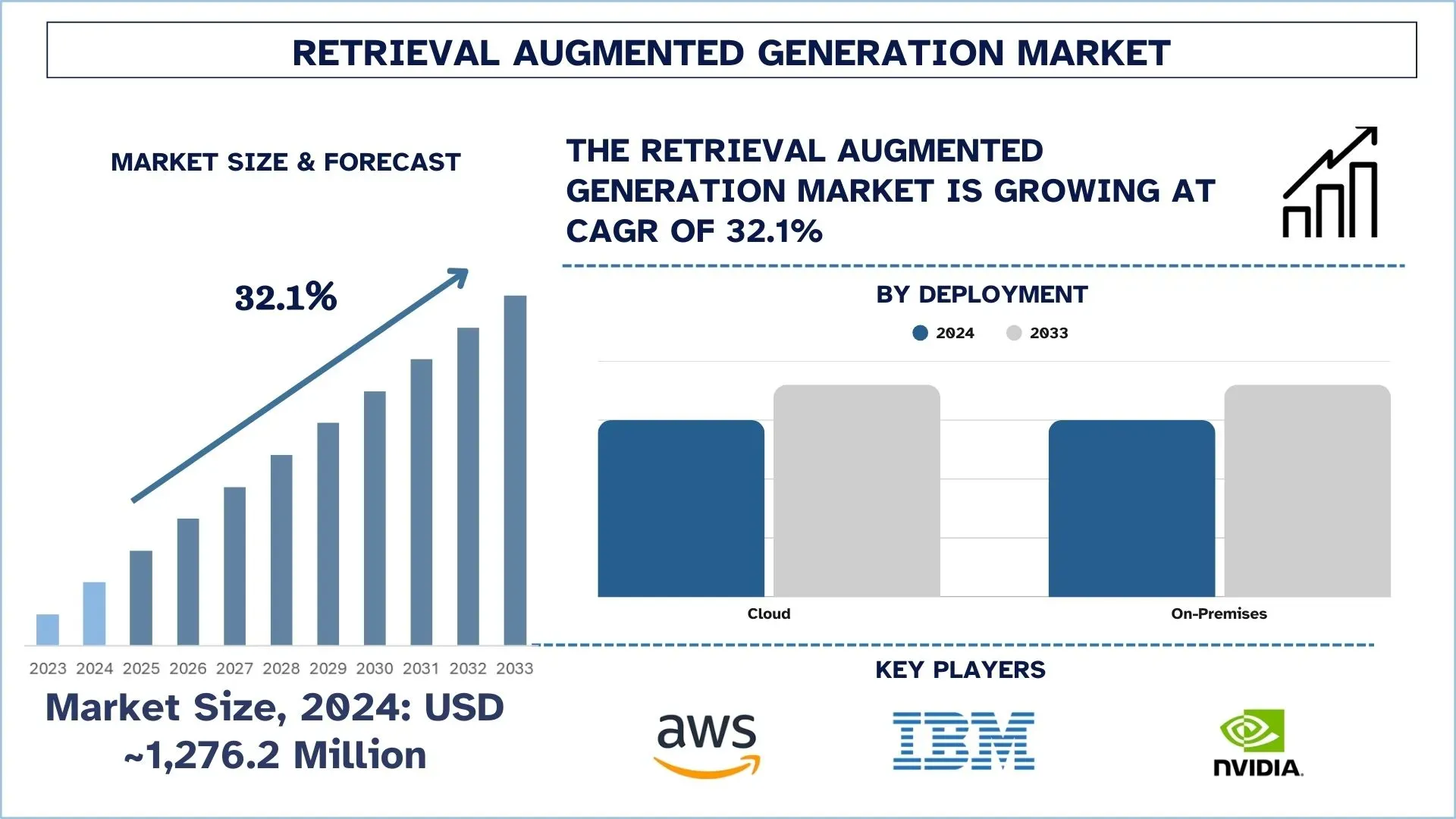 The global Retrieval Augmented Generation Market was valued at USD 1,276.2 Million in 2024 and is expected to grow to a strong CAGR of around 32.1% during the forecast period 2025-2033