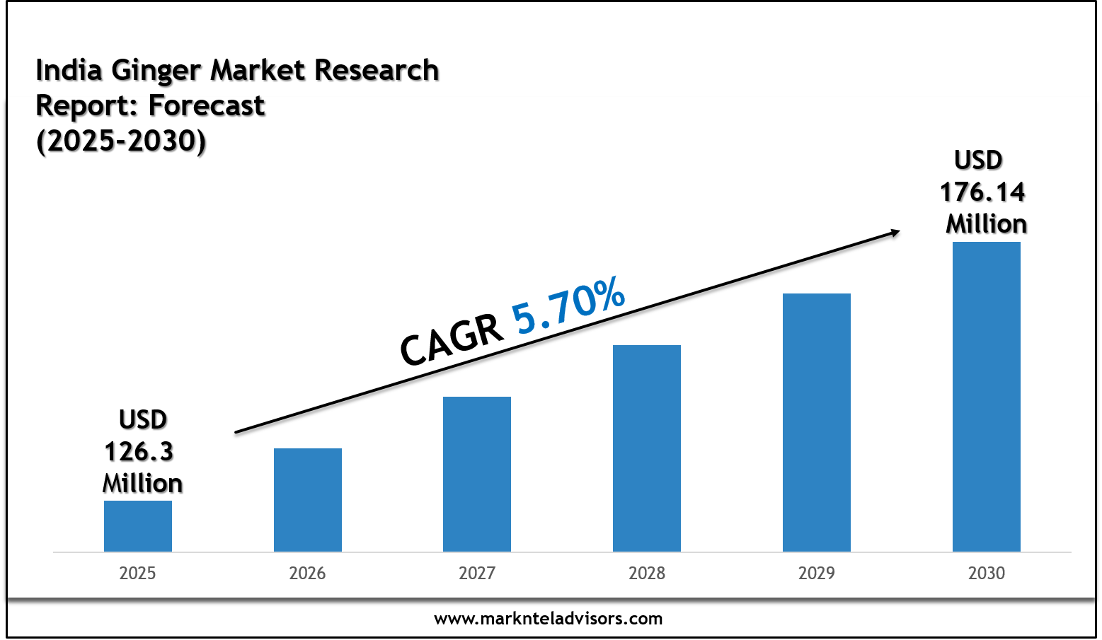 The India Ginger Market size is valued at around USD 126.3 million in 2025 and is expected to reach USD 176.14 million by 2030. Along with this, the market is estimated to grow at a CAGR of around 5.70% during the forecast period, i.e., 2025-30. The India Ginger Market is significantly growing due to several growth factors, including the high local cultivation & production of ginger in the country, the rising support by the Indian government, the increasing demand from the cosmetics sector, the growing infusion of ginger in nutraceutical products, the adoption of ginger-based beverages, and many more.