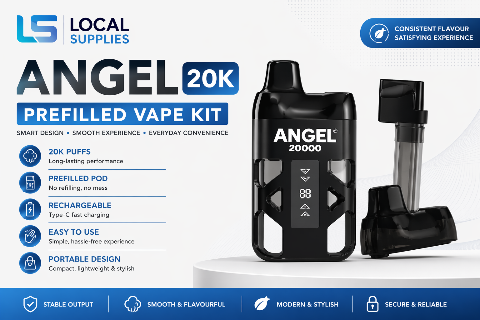 The Angel 20K Prefilled Vape Kit is a compact, rechargeable device that uses prefilled pods. The Angel 20K Prefilled Vape Kit is designed to reduce manual handling, making it suitable for those who prefer a simple and organised setup.
