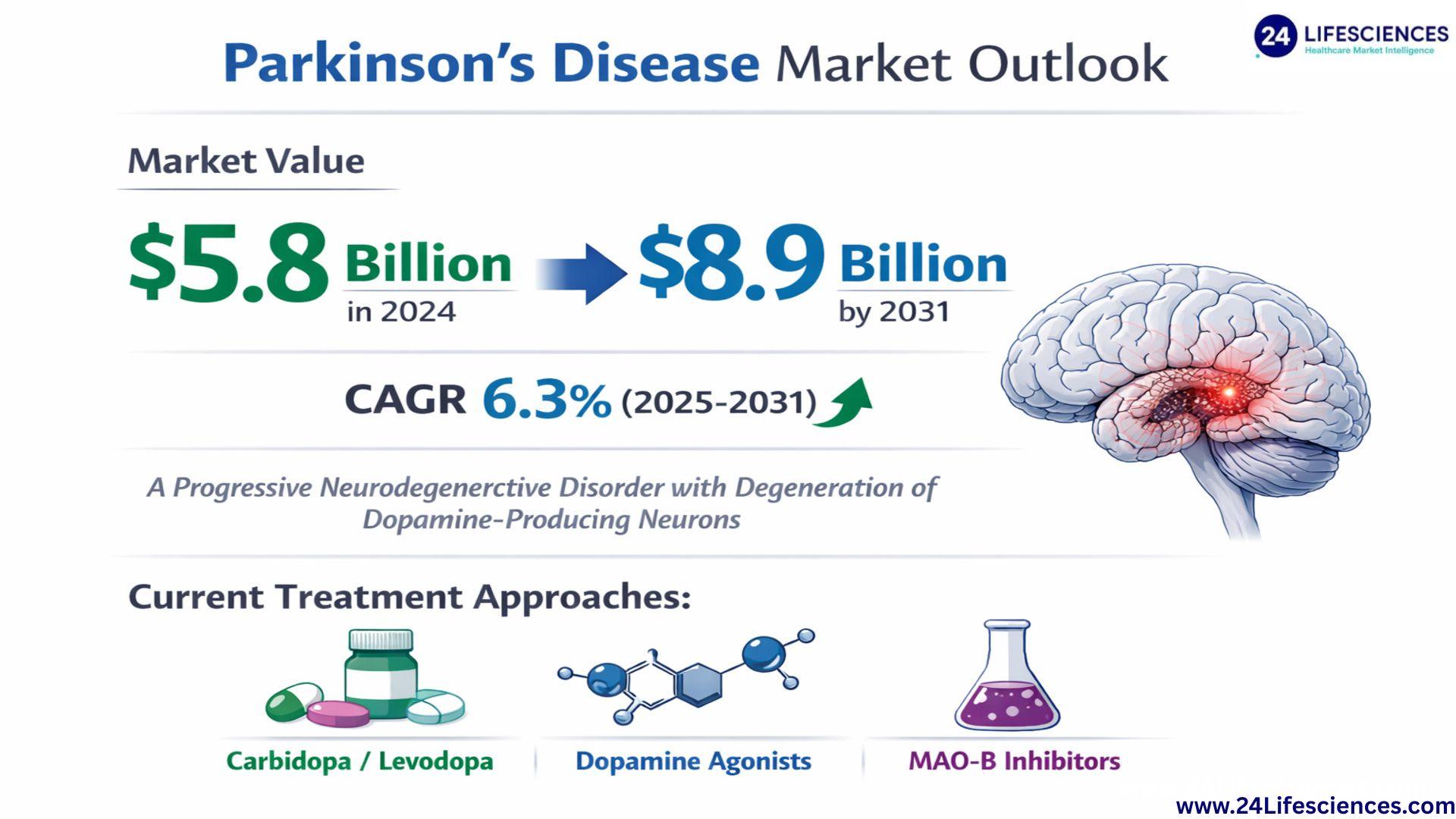 According to a newly published market research report by 24LifeSciencesglobal Parkinson's Disease market was valued at USD 5.8 billion in 2024 and is projected to reach USD 8.9 billion by 2031, growing at a compound annual growth rate (CAGR) of 6.3% during the forecast period 20252031.