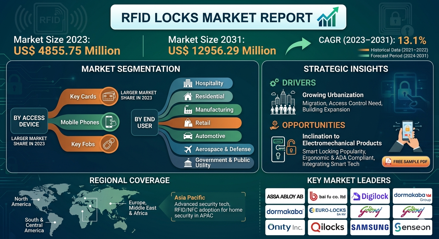 The RFID Locks Market Share is experiencing strong growth supported by rising adoption of smart building technologies and increasing focus on digital security infrastructure. The market size is projected to grow from US$ 4,855.75 million in 2023 to US$ 12,956.29 million by 2031, registering a CAGR of 13.1% during 2023–2031. Growth is driven by increasing deployment of smart homes, expanding hospitality automation, rising security concerns, and rapid integration of IoT-enabled access control systems across multiple end-use industries.