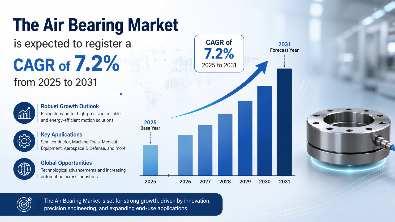 The global demand for precision across manufacturing and research sectors continues to escalate. According to the latest industry data, the Air Bearing Market is expected to register a CAGR of 7.2% from 2025 to 2031. This steady growth rate reflects the increasing integration of air bearing technology into sophisticated machinery used for semiconductor fabrication, medical imaging, and aerospace testing. As industries move toward automated and maintenance free operations, the adoption of air based suspension systems is becoming a standard requirement for high performance applications.